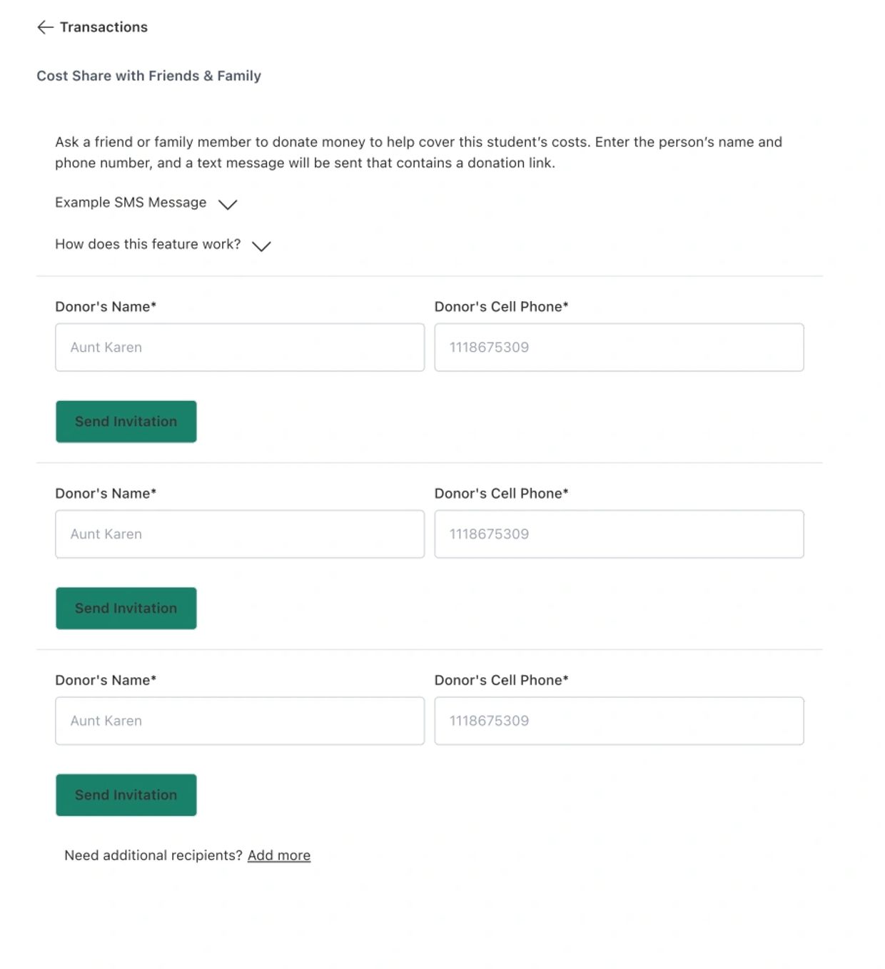 To share your personal CutTime link for donations, navigate to your account dashboard, find the "Transactions" section, and click "Share these costs"; then, enter the contact details of the people you want to send the donation link to and click "Send invitation" - this will send them a personalized link to contribute to your account directly through CutTime.